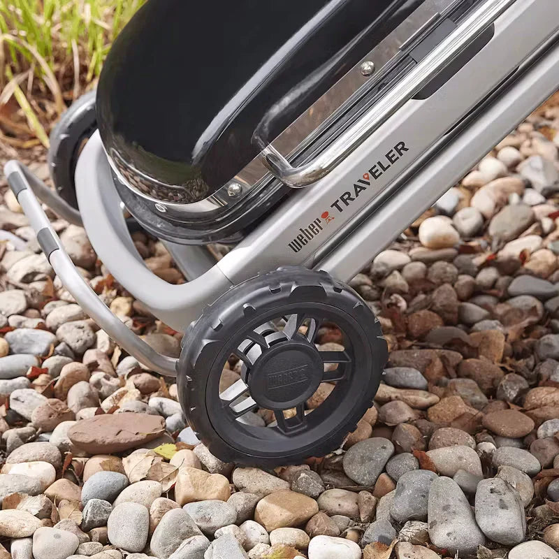 The Weber Traveler Gas BBQ barbecue reflects the signature design and high-quality material hallmarks of Weber products, including a porcelain-enamelled lid, cook box, and cast-iron cooking grates. Porcelain-enamel offers superior heat retention and durability, while the cast-iron grates promote even heat distribution across the entire barbecuing surface to help create evenly cooked food and that coveted, delicious sear.